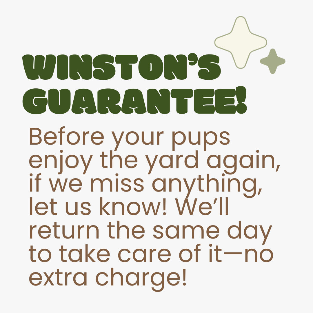 We understand that life happens. If you ever need to pause service for a valid reason, please don’t hesitate to reach out. We’re happy to work with you when possible; communication is key.3. Cancellations and Refunds- Cancellation Policy:Customers may cancel their subscription at any time by contacting us via email at [email protected] or by calling 346-351-8398.Cancellations must be made at least 2 days before the next billing cycle to avoid being charged for the following month.- Refunds:No refunds will be issued for services already performed or for partial months.- Service Cancellations by Us:In the rare case that we need to cancel a visit due to extreme weather conditions (such as storms, flooding, or hurricanes) or an emergency on our end, customers will be notified as soon as possible. Biweekly and monthly subscribers will be rescheduled to the following week. Weekly subscribers will have the option to receive:A. A full refund for the missed visit or,B. A complimentary service of equal value added to your next scheduled visit (examples include pet waste cleanup, light leaf removal, light weed removal, light shrub trimming, etc.),We do our best to maintain a reliable schedule, and we truly appreciate your understanding if nature or emergencies interfere.4. Scope of Services- What’s Included:Regular removal of dog waste from your property and/or regular lawn care (mowing, edging, and debris cleanup) based on the agreed schedule.- Customer Responsibilities:Provide safe and unobstructed access to your property during scheduled visits.Notify us of any changes to property access or special instructions.- Winston’s Guarantee: Our Poop-Free PromiseWe aim to provide a thorough and reliable cleanup every time. If you notice any missed waste after your service, please notify us within 12 hours of your visit and before your pet re-enters the yard. If reported within this time frame, we’ll return to your property the same day or next business day to remove the missed waste, free of charge.Reports made after 12 hours may not be eligible for a complimentary return visit, as new waste may have accumulated.5. Service Adjustments- Rescheduling:Customers may request to reschedule a service with at least 24 hours’ notice.Missed services due to weather or other unforeseen events will be rescheduled during the same week.- Service Changes:Any changes to service frequency or other details must be requested by contacting us directly. If applicable, changes to the bill will take effect the following month.- Pet Updates:If you add a new dog to your household or need to make adjustments to your subscription, please let us know so we can update your service accordingly. We understand that circumstances change, and if you no longer require service for a pet, just reach out to us—we’re here to help.- Pet Waste Removal in Overgrown Grass Policy:For safety and quality reasons, we ask that yards receiving pet waste cleanup services be maintained regularly. If the grass is over 6 inches in height, it becomes significantly harder to locate and remove all waste, and may lead to: missed waste, extended cleanup times, and excess wear and tear on our tools.If we arrive and the grass is overgrown, one of the following will apply:A. A $10 overgrowth fee will be added to the visit to cover the additional time and effort required, and Winston’s Guarantee will no longer apply for that visit; or,
