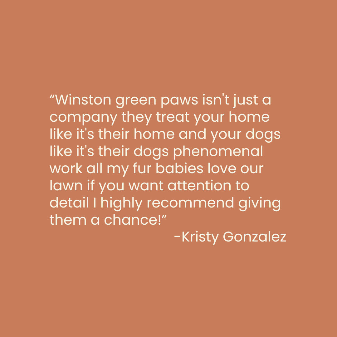“Winston green paws isn’t just a company they treat your home like it’s their home and your dogs like it’s their dogs phenomenal work all my fur babies love our lawn if you want attention to detail I highly recommend giving them a chance!”