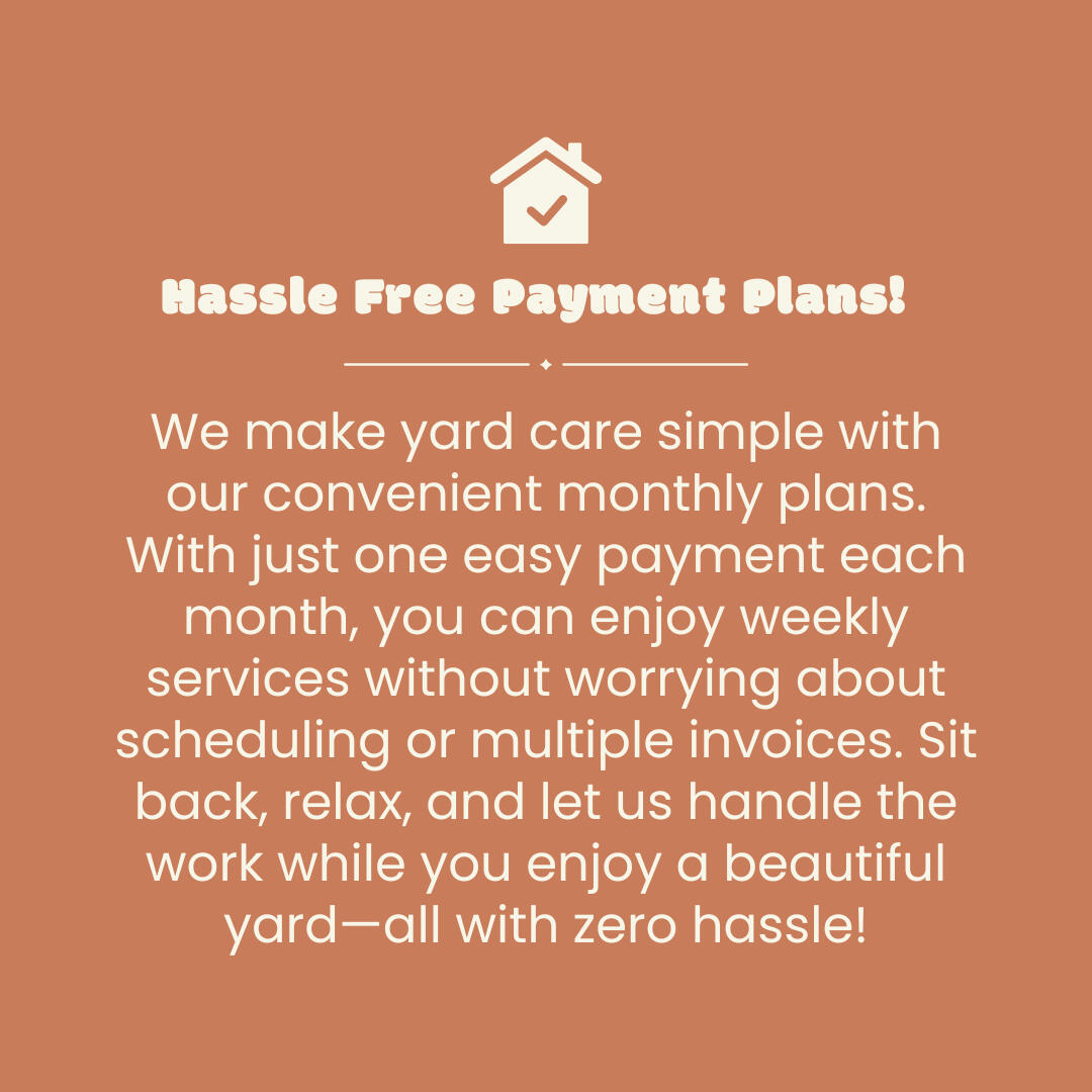 - Our subscription plans keep your lawn and yard fresh without the hassle! We bill at the beginning of each month for recurring services like pet waste removal and lawn mowing, so your spot stays secured on our schedule with no interruptions and without dealing with multiple invoices. Plus, subscribing customers receive top priority, even during weather delays!- No contracts, no hidden fees! You can cancel or adjust your service frequency anytime after your current billing cycle ends. Enjoy flexible, convenient, and affordable lawn care, commitment-free!