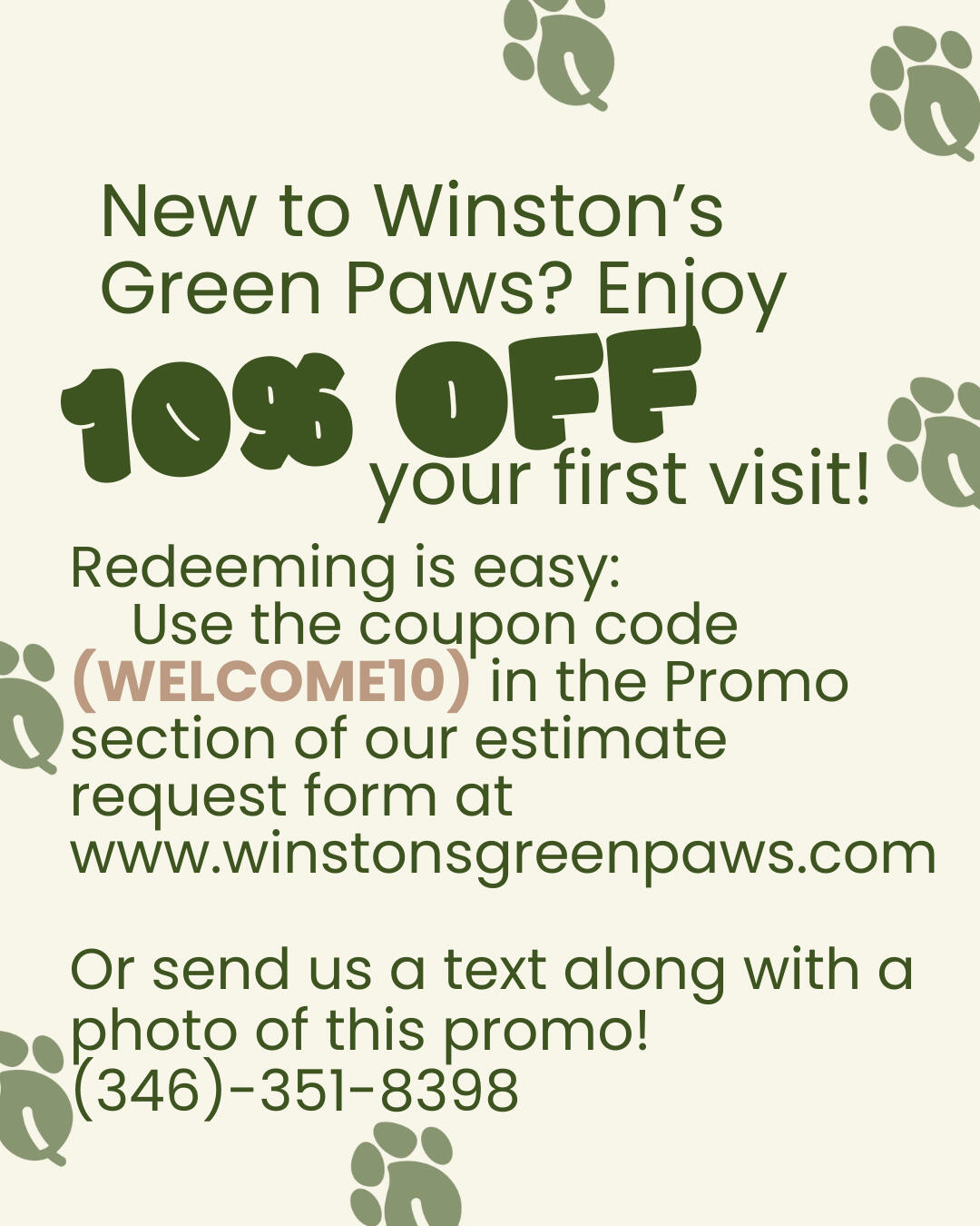 B. You may choose to reschedule your visit for after the lawn has been mowed. If the lawn is not mowed within 24 hours of the originally scheduled visit, the service will still be considered missed, and no refund will be issued. We appreciate your understanding, as uncut grass can impact the quality and efficiency of our service.We want to provide the most thorough and reliable service possible; keeping grass maintained helps us do that.6. Liability- Damage or Loss:Winston's Green Paws is not responsible for property damage caused by factors beyond our control (e.g., animals, weather).- Service Guarantee:We strive to provide high-quality service. If you’re not satisfied with the service, please contact us within 24 hours of a visit to resolve the issue.7. Waste DisposalAll pet waste collected during service will be disposed of in the customer's designated on-site waste bin. For sanitation and odor control, waste is double-bagged in scented bags. If no accessible bin is available, alternative disposal arrangements may incur an additional fee.8. TerminationWinston's Green Paws reserves the right to terminate your subscription at any time for non-payment, unsafe working conditions, or any other valid reasons.9. Agreement to TermsBy subscribing, you agree to these terms and conditions. These terms may be updated from time to time, with notice provided via email or our website.----------Privacy Policy- Collection of Personal Information:We may collect personal information such as your name, phone number, email address, and payment details to process your subscription and provide services.- Use of Personal Information:Your personal information will be used solely for the purpose of providing services, processing payments, and communication regarding your subscription.- Data Protection:We take the security of your personal information seriously and use appropriate measures to protect it.- Sharing of Information:Your information will not be shared with third parties except as required for payment processing or as required by law.Contact UsFor questions, cancellations, or service changes, please contact us at:[email protected]- 346-351-8398